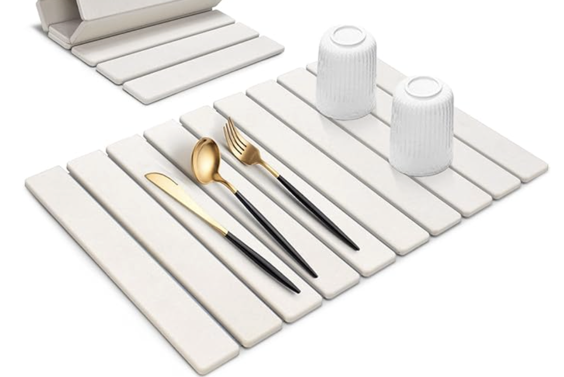 This drying mat is made of non-toxic, food grade diatomite and is ultra absorbent. I have the Modern white, which blends seamlessly with my white countertops, but I will say that if any liquid of color spills on it, it stains a bit. I will go with the darker grey when it’s time to replace. It rolls up for easy storage.